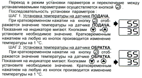 встановленої користувачем температури t датчика ОБРАТКА. Насос при нагріванні залишається включеним. При досягненні температури t. терморегулятор відключає нагрівальний елемент (котел), а насос продовжує працювати встановлене користувачем час роботи насоса (від 1-ї до 10-ти хвилин). Далі опалювальна система самостійно остигає на встановлене значення гістерезису At і цикл повторюється.